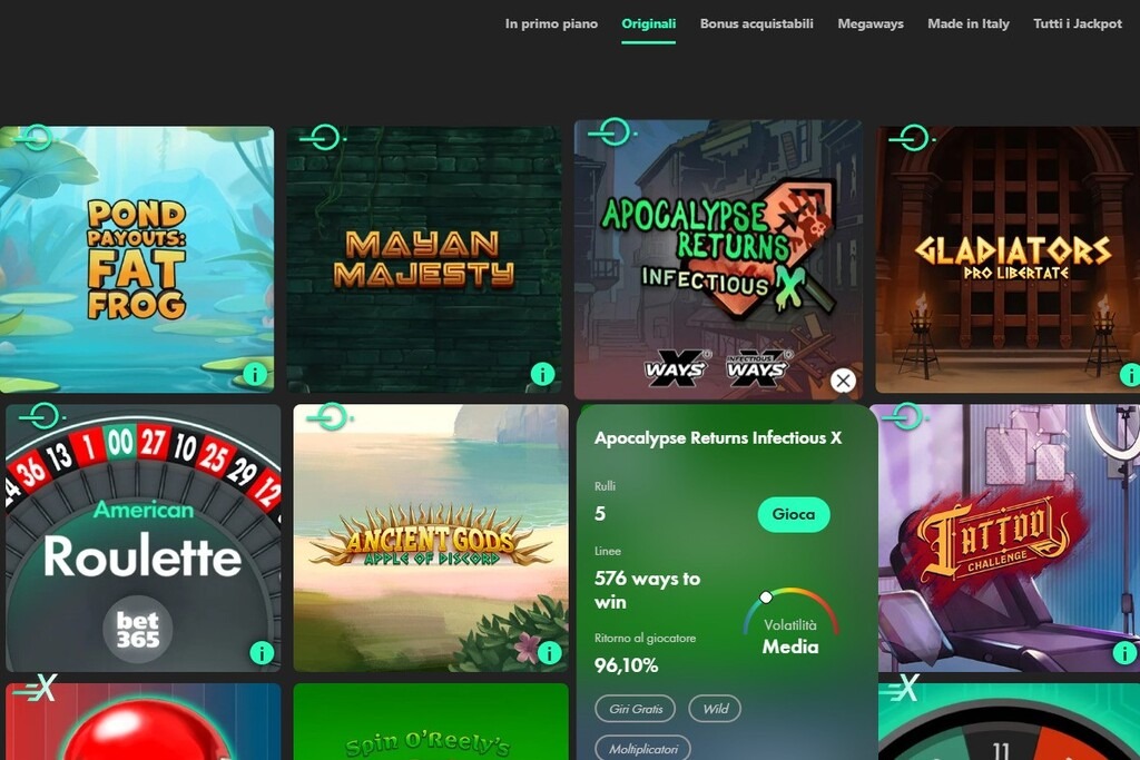 Il procedimento per conoscere il payout delle slot-machine di Bet365 Casino è molto semplice e, a differenza di altre portali, non richiede la registrazione. Per verificarlo, è necessario accedere alla piattaforma, selezionare la categoria “Slot” e scegliere tra i diversi gruppi. Qui viene mostrato l’elenco di quelle disponibili e, nell’immagine di ciascun game, è presente in basso a destra il simbolo “I” di colore verde. Cliccando su di esso, si aprirà un menu a tendina contenente tutti i dettagli tecnici, inclusa la percentuale di ritorno al giocatore.